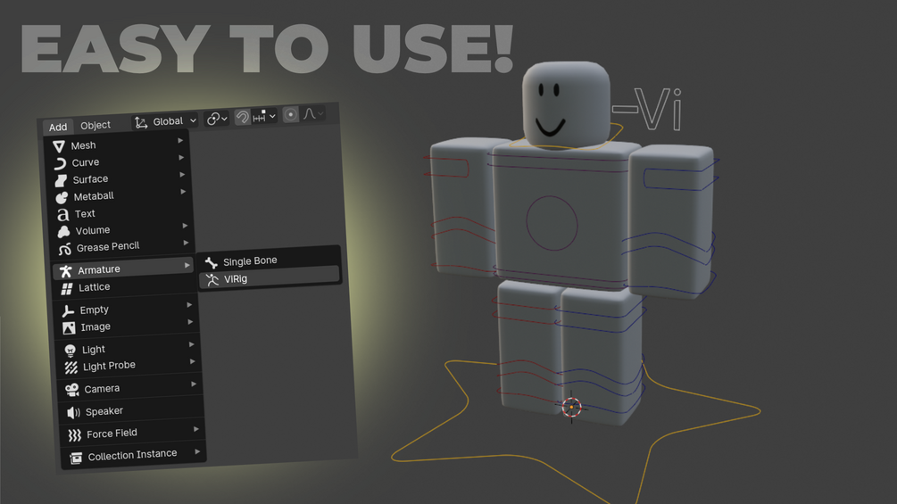 Hi! Introducing; ViRig. ViRig is a simple blocky 1.0 Roblox rig for Blender. It is my first Roblox rig addon, and is made purely for me to practice.
